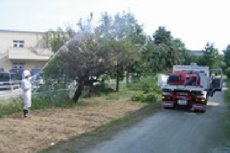 アメリカシロヒトリの場合は柿の木、梅の木、杏の木、桜の木などを好み、被害にあうと茶色に枯れた状態になります。その後、他の植木などに移動しますので見つけたら早めの消毒をおすすめいたします。当社ではエンジン式の高圧動墳機を使いますので、広範囲消毒や高い木の消毒も可能です。